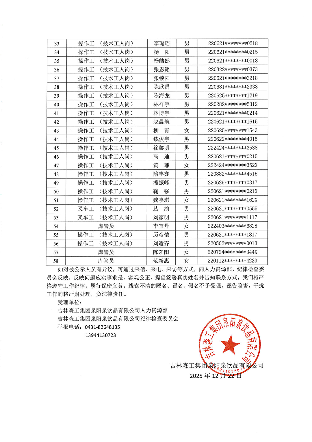 吉林森工集團(tuán)泉陽泉飲品有限公司2025年度下半年社會(huì)化公開招聘擬錄用人員公示